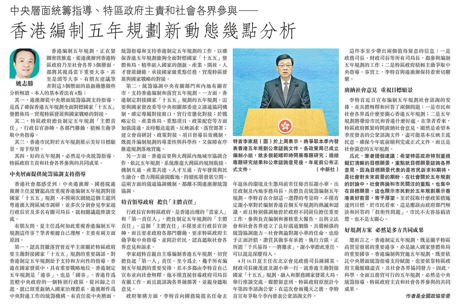 總而言之,香港制定五年規劃,既是關乎特區高質量發展的重要港事,亦是融入國家整體佈局的重要國事。香港編制與實施五年規劃,既要依託中央層面統籌指導支持賦能,也要依靠特區政府主動履職盡責,及社會各界協同發力。因此,科學、全面且務實可行的五年規劃,必然是中央統籌指導、特區政府主責和社會各界參與的共同成果。