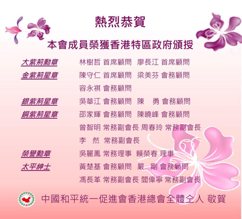熱烈祝賀本會成員榮獲香港特區政府頒授勳銜