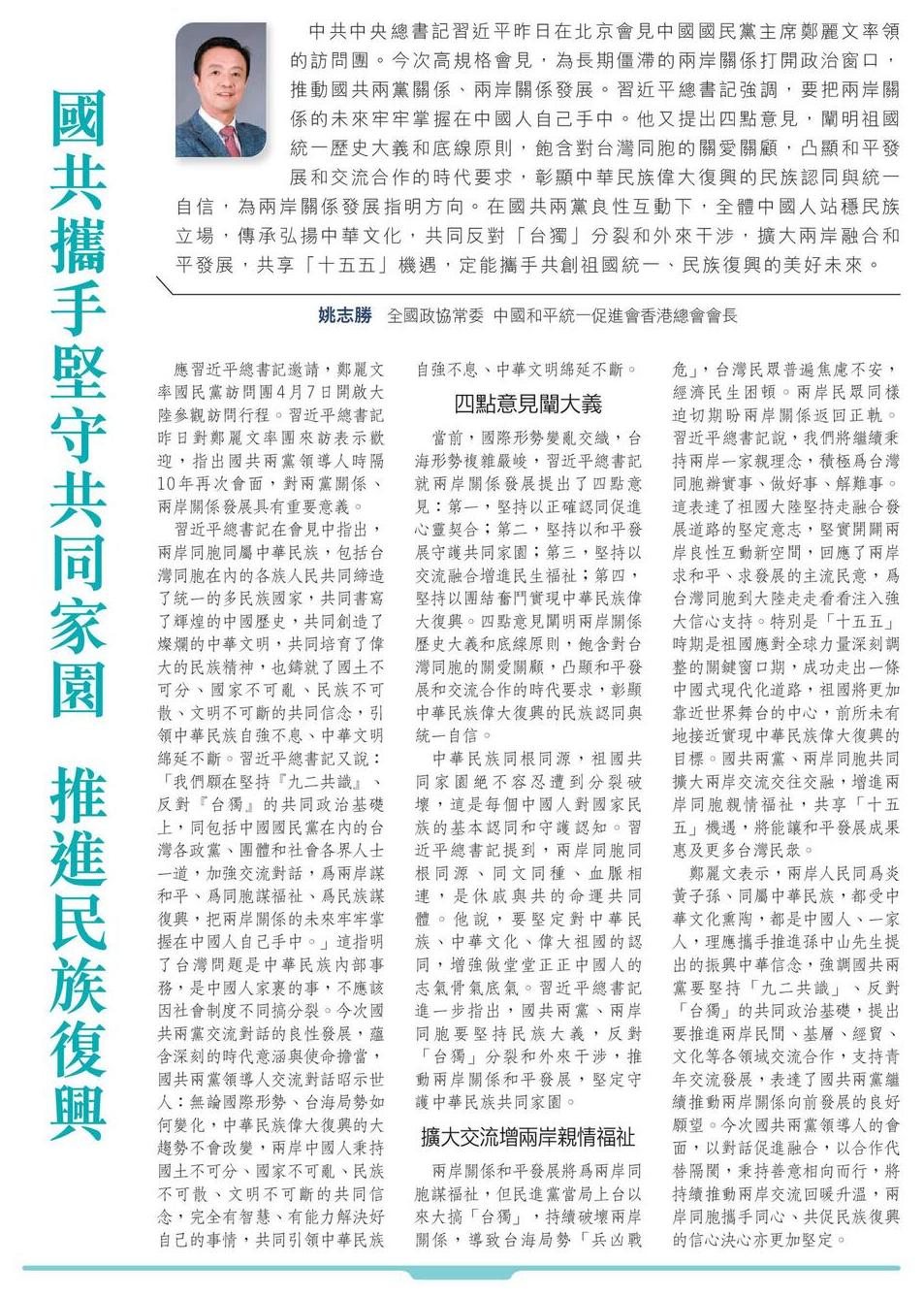 中共中央总书记习近平昨日在北京会见中国国民党主席郑丽文率领的访问团。今次高规格会见,为长期僵滞的两岸关系打开政治窗口,推动国共两党关系、两岸关系发展。习近平总书记强调,要把两岸关系的未来牢牢掌握在中国人自己手中。他又提出四点意见,阐明祖国统一历史大义和底线原则,饱含对台湾同胞的关爱关顾,凸显和平发展和交流合作的时代要求,彰显中华民族伟大复兴的民族认同与统一自信,为两岸关系发展指明方向。在国共两党良性互动下,全体中国人站稳民族立场,传承弘扬中华文化,共同反对“台独”分裂和外来干涉,扩大两岸融合和平发展,共享“十五五”机遇,定能携手共创祖国统一、民族复兴的美好未来。