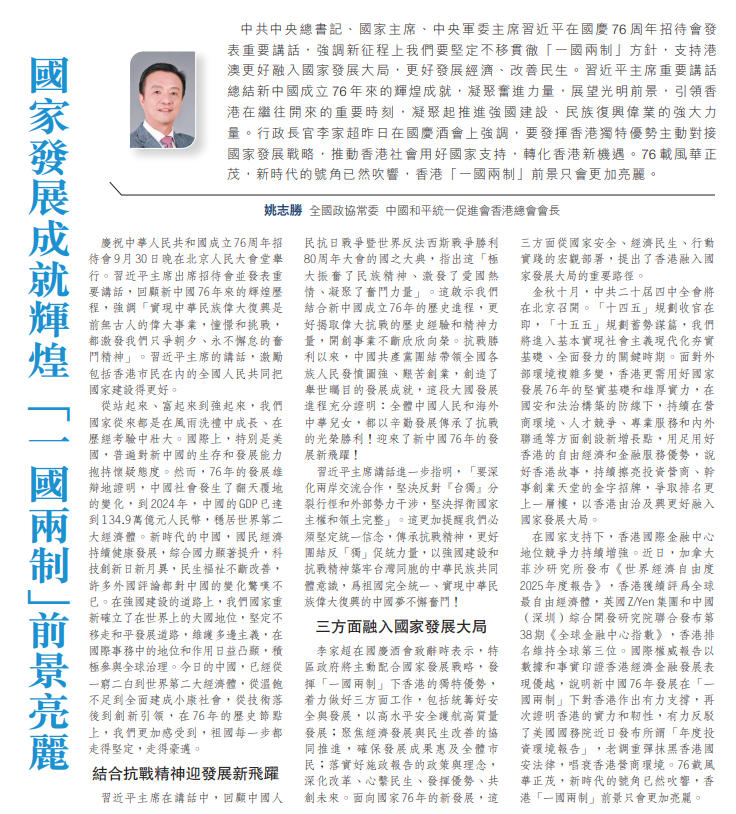 在國家支持下,香港國際金融中心地位競爭力持續增強。近日,加拿大菲沙研究所發布《世界經濟自由度2025年度報告》,香港獲續評為全球最自由經濟體,英國Z/Yen集團和中國(深圳)綜合開發研究院聯合發布第38期《全球金融中心指數》,香港排名維持全球第三位。國際權威報告以數據和事實印證香港經濟金融發展表現優越,說明新中國76年發展在「一國兩制」下對香港作出有力支撐,再次證明香港的實力和靭性,有力反駁了美國國務院近日發布所謂「年度投資環境報告」,老調重彈抹黑香港國安法律,唱衰香港營商環境。76載風華正茂,新時代的號角已然吹響,香港「一國兩制」前景只會更加亮麗。