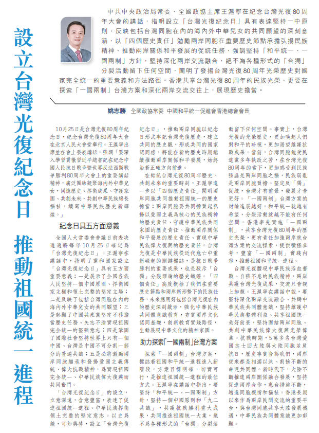 中共中央政治局常委、全國政協主席王滬寧在紀念台灣光復80周年大會的講話,指明設立「台灣光復紀念日」具有表達堅持一中原則、反映包括台灣同胞在內的海內外中華兒女的共同願望的深刻意涵,以「四個歷史責任」勉勵兩岸同胞在重要歷史節點承擔弘揚民族精神、推動兩岸關係和平發展的促統任務,強調堅持「和平統一、一國兩制」方針,堅持深化兩岸交流融合,絕不為各種形式的「台獨」分裂活動留下任何空間,闡明了發揚台灣光復80周年光榮歷史對國家完全統一的重要意義和方法路徑。香港共享台灣光復80周年的民族光榮,更要在探索「一國兩制」台灣方案和深化兩岸交流交往上,展現歷史擔當。