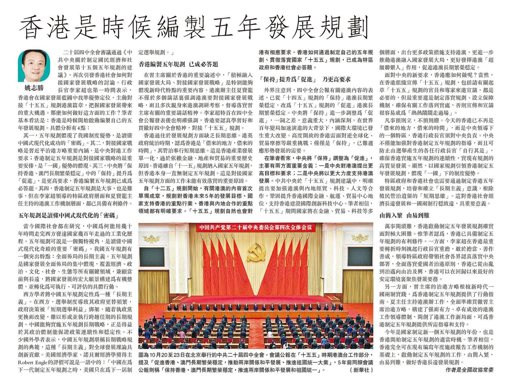自「十二五」規劃開始,有關港澳的內容首次單獨成章,規劃對香港未來5年的發展目標、國家支持香港的重點行業、香港與內地合作的重點領域都有明確要求。「十五五」規劃自然也會對港有相應要求。香港如何通過制定自己的五年規劃、貫徹落實國家「十五五」規劃,已成為特區政府和香港社會必答題。