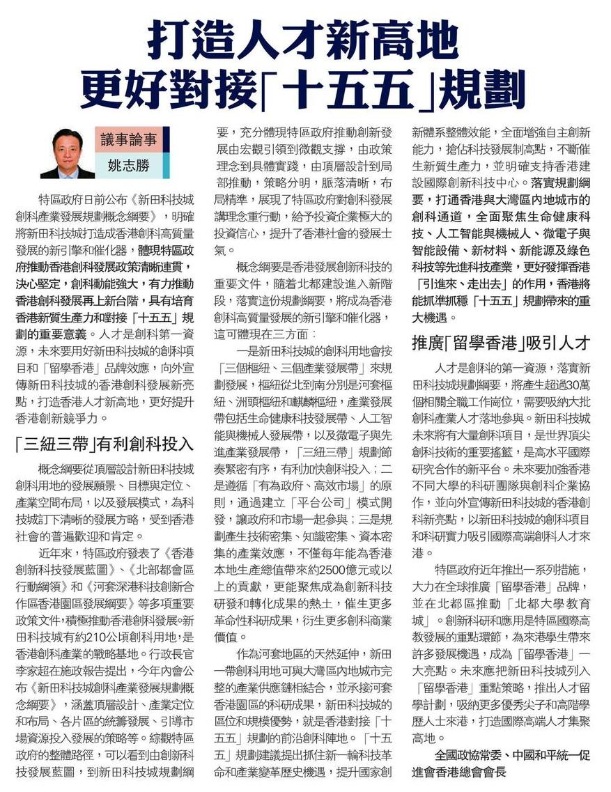 特區政府日前公布《新田科技城創科產業發展規劃概念綱要》,明確將新田科技城打造成香港創科高質量發展的新引擎和催化器,體現特區政府推動香港創科發展政策清晰連貫,決心堅定,創科動能強大,有力推動香港創科發展再上新台階,具有培育香港新質生產力和對接「十五五」規劃的重要意義。人才是創科第一資源,未來要用好新田科技城的創科項目和「留學香港」品牌效應,向外宣傳新田科技城的香港創科發展新亮點,打造香港人才新高地,更好提升香港創新競爭力。