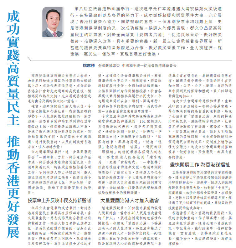 這次立法會選舉的過程和結果,生動地印證了新選制是一套符合香港實際、符合香港利益的高質量民主制度,展現了全面落實「愛國者治港」原則的特區治理新氣象。通過積極參與選舉,社會各界充分凝聚了拚經濟、謀發展、惠民生、促改革的強大共識。面對火災所暴露出來的各種問題,社會充分理解到必須通過更全面的改革,從制度上消除各種安全隱患。這次立法會選舉對於推動改革、做好善後、聚焦發展,都具有重要的作用。
