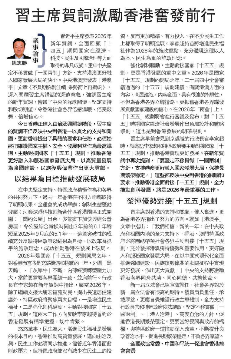 習近平主席發表2026年新年賀詞,全面回顧「十四五」期間國家在經濟、科技、民生及國際治理等方面取得的非凡成就,重申中央堅定不移貫徹「一國兩制」方針、支持港澳更好融入國家發展大局的決心。中央港澳辦發表「港澳平」文章《不負期許創佳績 乘勢而上再揚帆》,深入闡釋習主席講話的深遠意義,強調習主席的新年賀詞,傳遞了中央的深厚關懷、堅定支持和殷切期望,令香港社會各界倍感溫暖、倍受鼓舞、倍增信心。