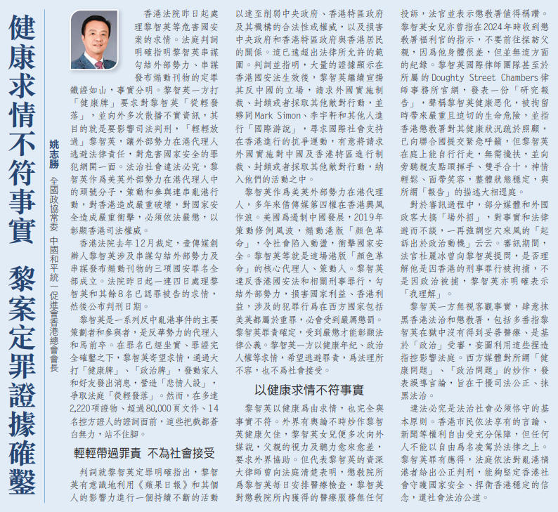 香港法院昨日起處理黎智英等危害國安案的求情。法庭判詞明確指明黎智英串謀勾結外部勢力、串謀發布煽動刊物的定罪鐵證如山,事實分明。黎智英一方打「健康牌」要求對黎智英「從輕發落」,並向外多次散播不實資訊,其目的就是要影響司法判刑,「輕輕放過」黎智英,讓外部勢力在港代理人逃避法律責任,對危害國家安全的罪犯網開一面。法治社會違法必究,黎智英作為美英外部勢力在港代理人中的頭號分子,策動和參與連串亂港行動,對香港造成嚴重破壞,對國家安全造成嚴重衝擊,必須依法嚴懲,以彰顯香港司法權威。