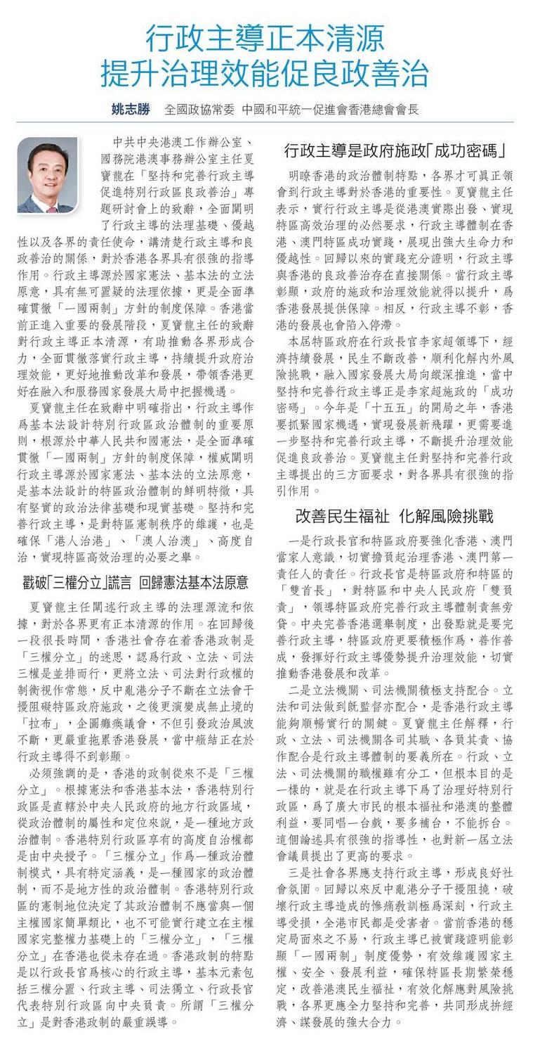 中共中央港澳工作辦公室、國務院港澳事務辦公室主任夏寶龍在「堅持和完善行政主導促進特別行政區良政善治」專題研討會上的致辭,全面闡明了行政主導的法理基礎、優越性以及各界的責任使命,講清楚行政主導和良政善治的關係,對於香港各界具有很強的指導作用。行政主導源於國家憲法、基本法的立法原意,具有無可置疑的法理依據,更是全面準確貫徹「一國兩制」方針的制度保障。香港當前正進入重要的發展階段,夏寶龍主任的致辭對行政主導正本清源,有助推動各界形成合力,全面貫徹落實行政主導,持續提升政府治理效能,更好地推動改革和發展,帶領香港更好在融入和服務國家發展大局中把握機遇。
