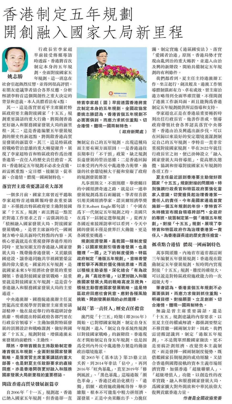 夏主任最近談到香港要主動做好跟國家「十五五」規劃對接的問題時,特別強調行政長官和特區政府要強化當家人意識,切實擔負起治理香港第一責任人的責任。今年是國家通過並實施新一個五年規劃的年份,李特首不失時機宣布親自領導跨部門、全政府的專班,統籌制定第一個「港版五年規劃」,對接「十五五」規劃,展現了李特首和特區政府作為治理香港第一責任人,為香港謀長遠的歷史責任擔當。