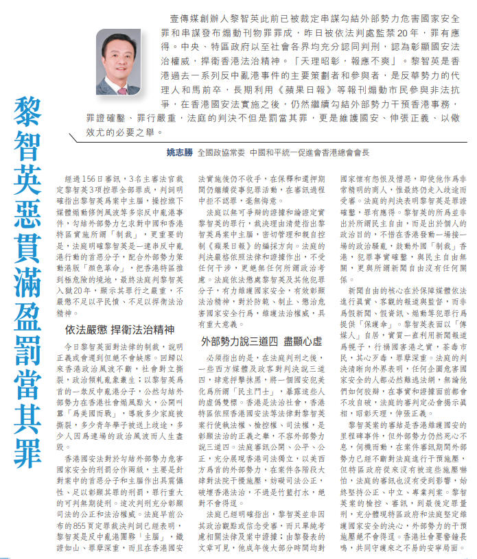 壹傳媒創辦人黎智英此前已被裁定串謀勾結外部勢力危害國家安全罪和串謀發布煽動刊物罪罪成,昨日被依法判處監禁20年,罪有應得。中央、特區政府以至社會各界均充分認同判刑,認為彰顯國安法治權威,捍衛香港法治精神。「天理昭彰,報應不爽」。黎智英是香港過去一系列反中亂港事件的主要策劃者和參與者,是反華勢力的代理人和馬前卒,長期利用《蘋果日報》等報刊煽動市民參與非法抗爭,在香港國安法實施之後,仍然繼續勾結外部勢力干預香港事務,罪證確鑿、罪行嚴重,法庭的判決不但是罰當其罪,更是維護國安、伸張正義、以儆效尤的必要之舉。